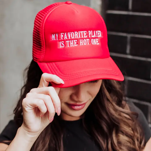 Red trucker hat White "My favorite player is the hot one" embroidered on the front.