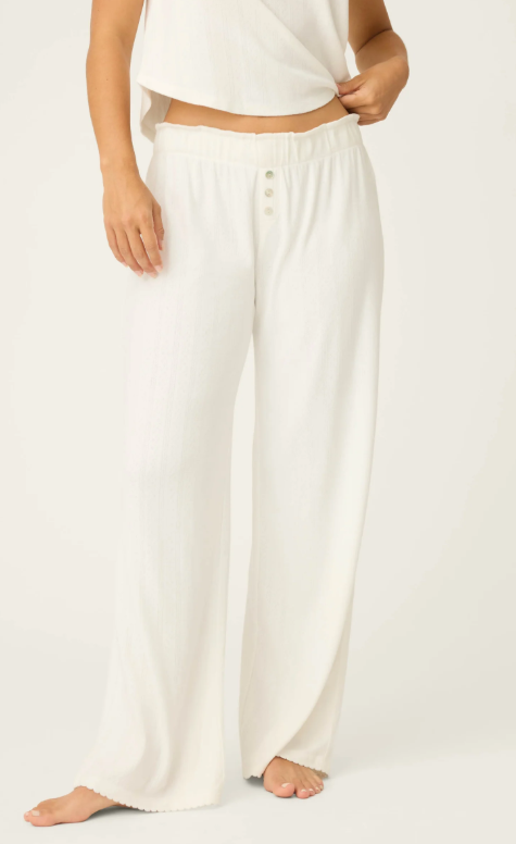 Soft, stretchy, airy patterned pointelle—truly what cloud-soft dreams are made of.The long-sleeve button-down top includes a relaxed silhouette, delicate picot trim, a soft V-neckline, and tonal buttons. The full-length lounge pants include an open-leg fit, delicate picot trim at the waistband, and an adjustable drawstring for all-day comfort.The ivory shade is the ultimate sleepwear neutral—clean and timeless.