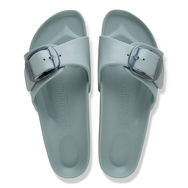 This is a new and modern interpretation of the BIRKENSTOCK classic Madrid. This version features our popular Big Buckle made from a stainless synthetic material and makes an impression with its durability and minimalist design. Modeled on the cork sandal, it is made from the ultra-lightweight and highly flexible synthetic material EVA. The high-quality, odor-neutral EVA has been tested for harmful substances and combines numerous positive attributes: it is very light, highly elastic, shock-absorbent, water-resistant, and skin-friendly.