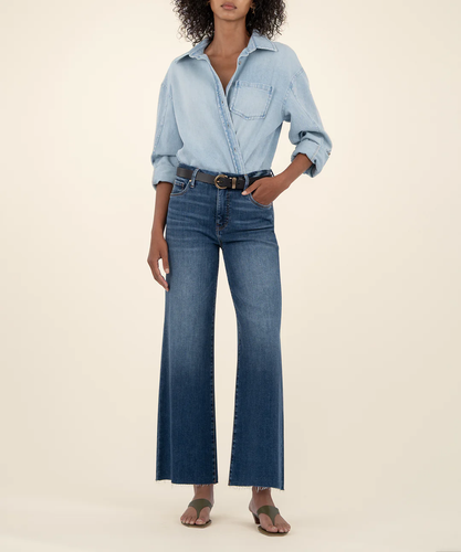 - Flatter your figure with these high rise wide leg jeans in a rich dark wash color. Designed with built-in Fab Ab pockets for a smooth silhouette, they’re finished with a modern raw hem for an effortlessly cool look.
