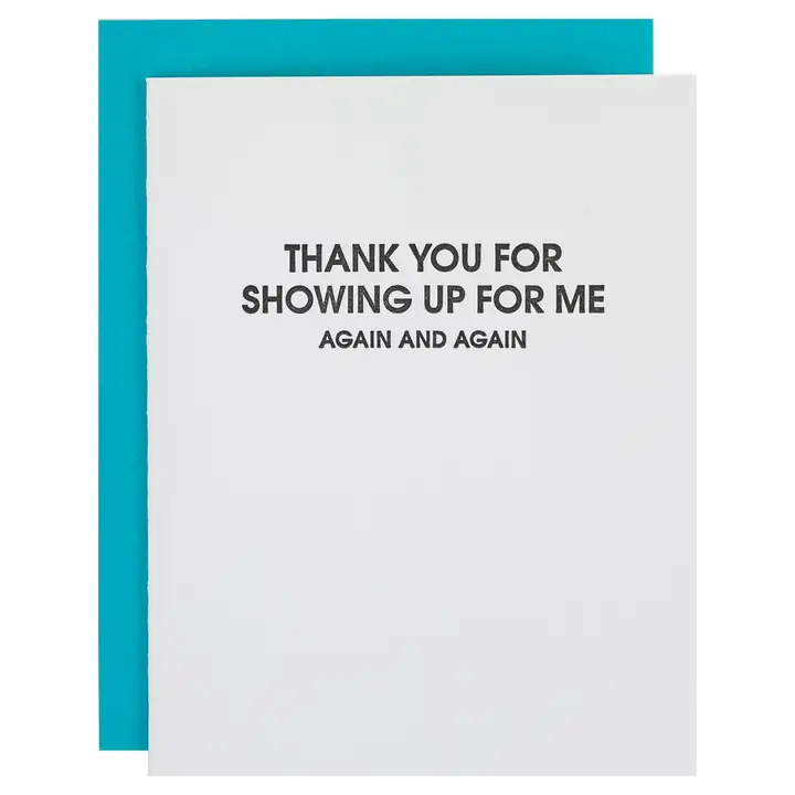 The "Thank You For Showing Up For Me Again" card is letterpress printed on a vintage printing press in sunny California.