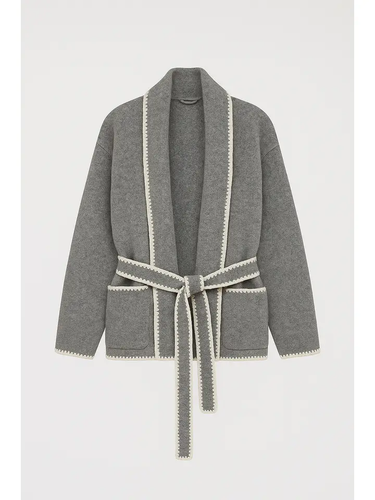 Wool-blended Flat White Signature Cardigan with Special Whipstitch Detail